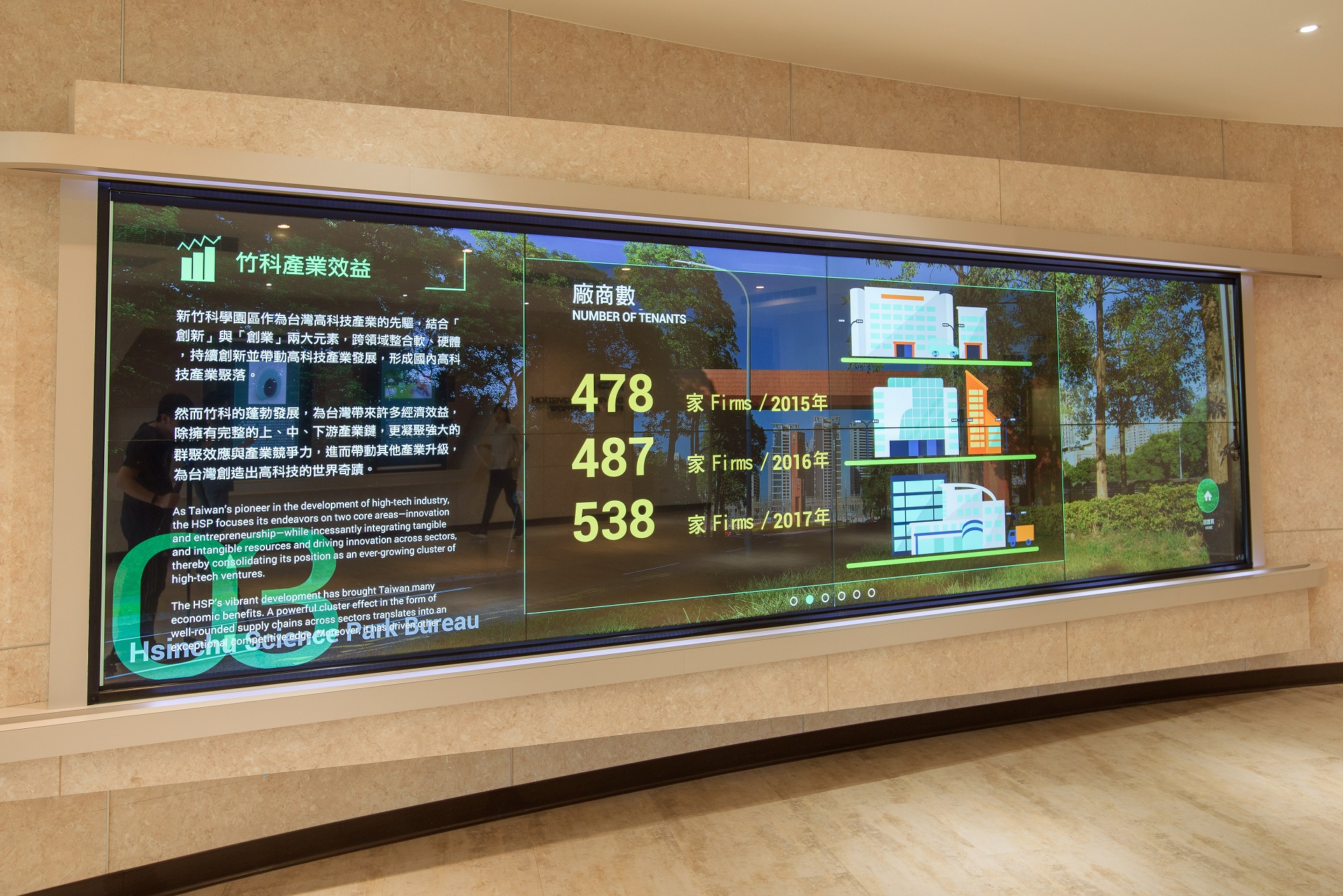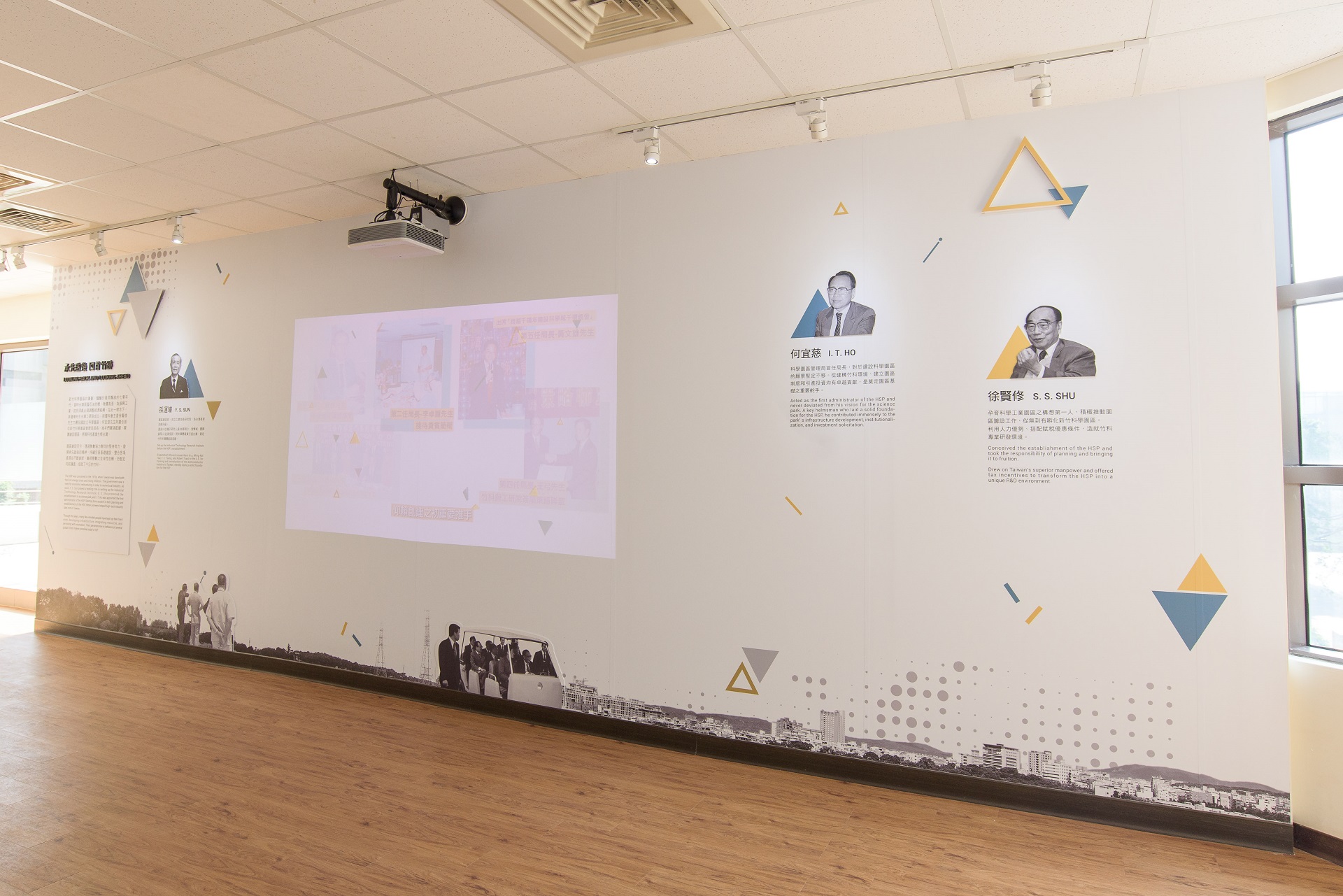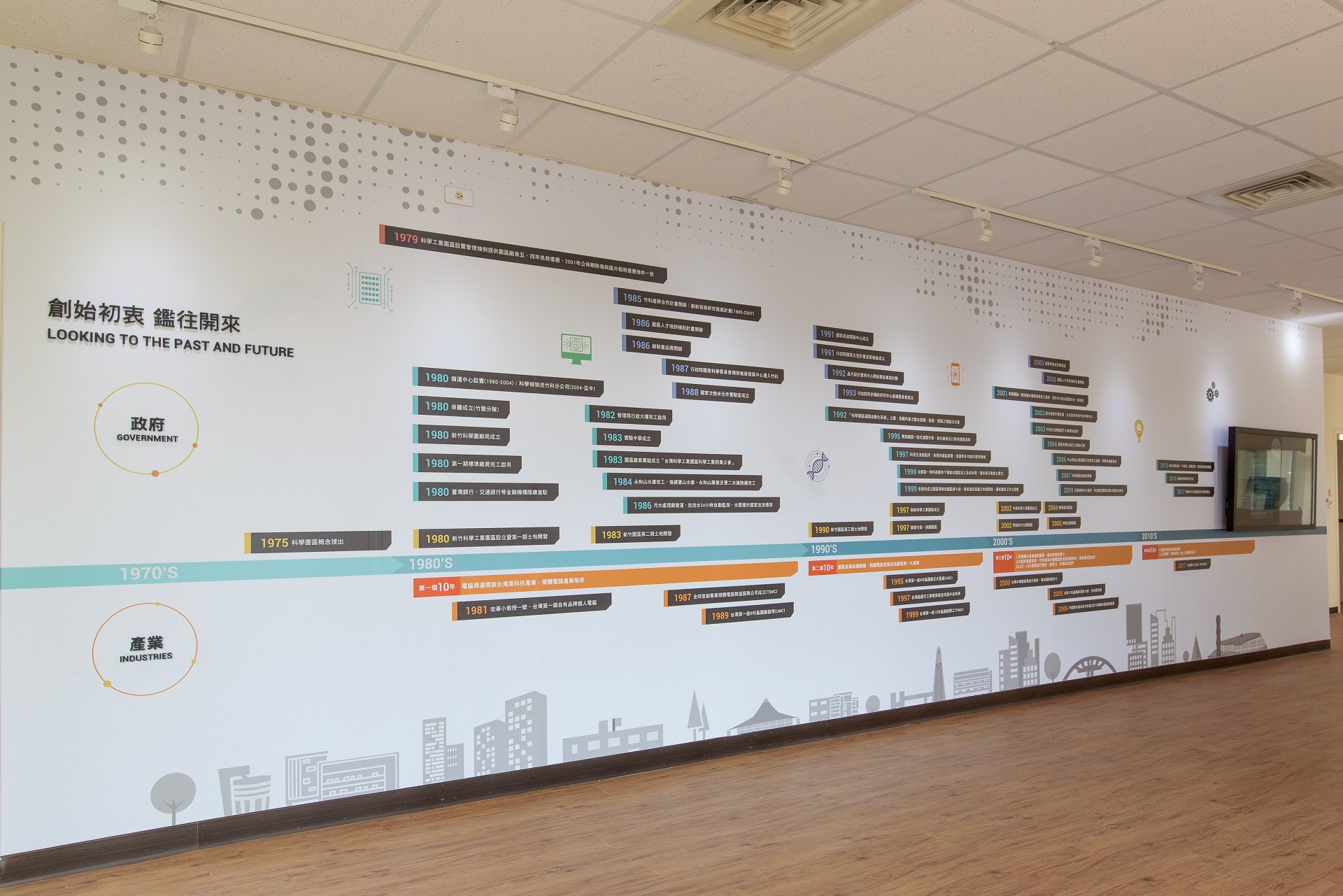 三樓進門後映入眼簾的是大面積的展示牆,跟隨著時間軸的步伐為訪賓介紹竹科的發展歷程,另外,我們透過「承先啟後」短片,講述園區重要推手及竹科人如何齊心努力,一磚一瓦的構建出如今的新竹科學園區,帶您走過歷史更迭,從「原點」認識竹科。