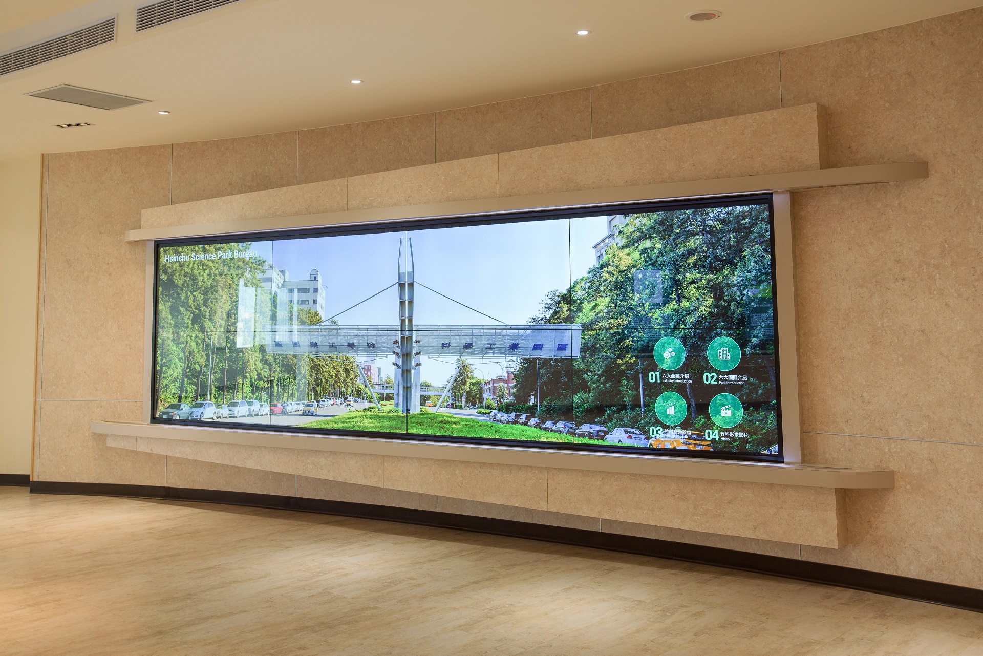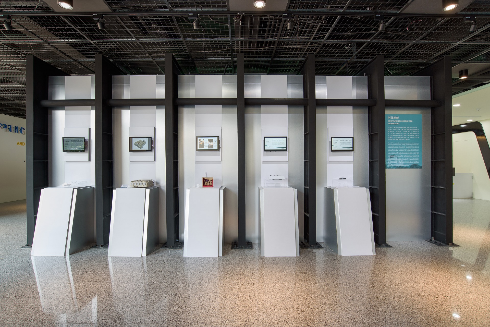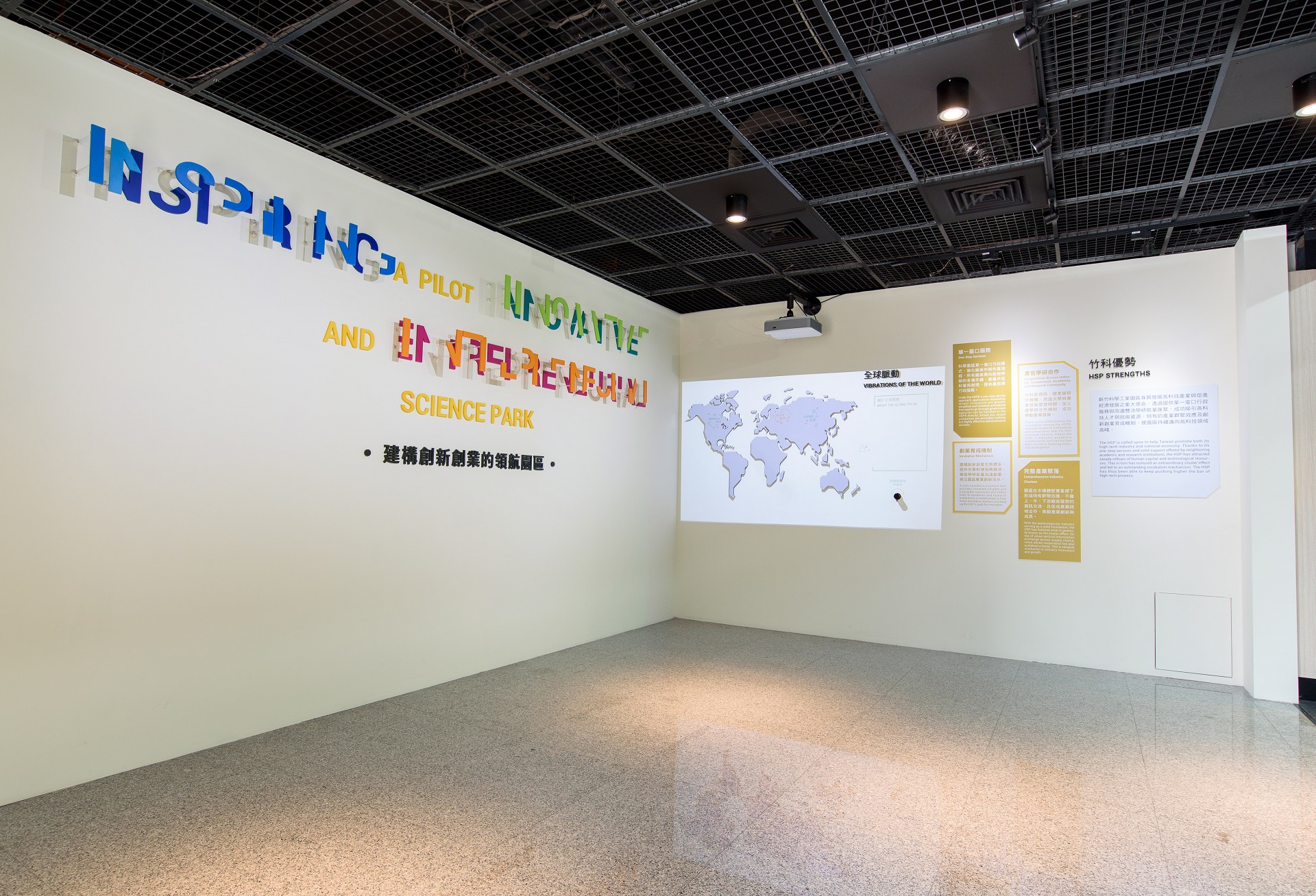 三樓進門後映入眼簾的是大面積的展示牆,跟隨著時間軸的步伐為訪賓介紹竹科的發展歷程,另外,我們透過「承先啟後」短片,講述園區重要推手及竹科人如何齊心努力,一磚一瓦的構建出如今的新竹科學園區,帶您走過歷史更迭,從「原點」認識竹科。